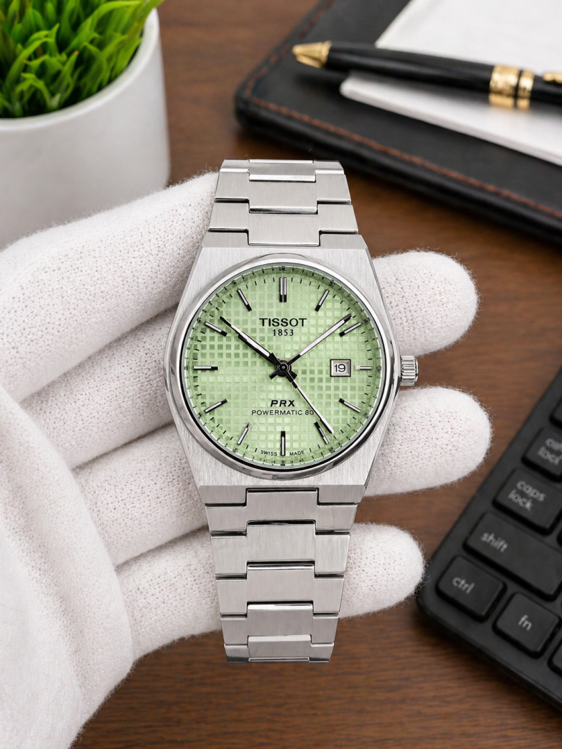 TISSOT PRX QUARTZ SILVER LIGHT GREEN TEXTURE DIAL